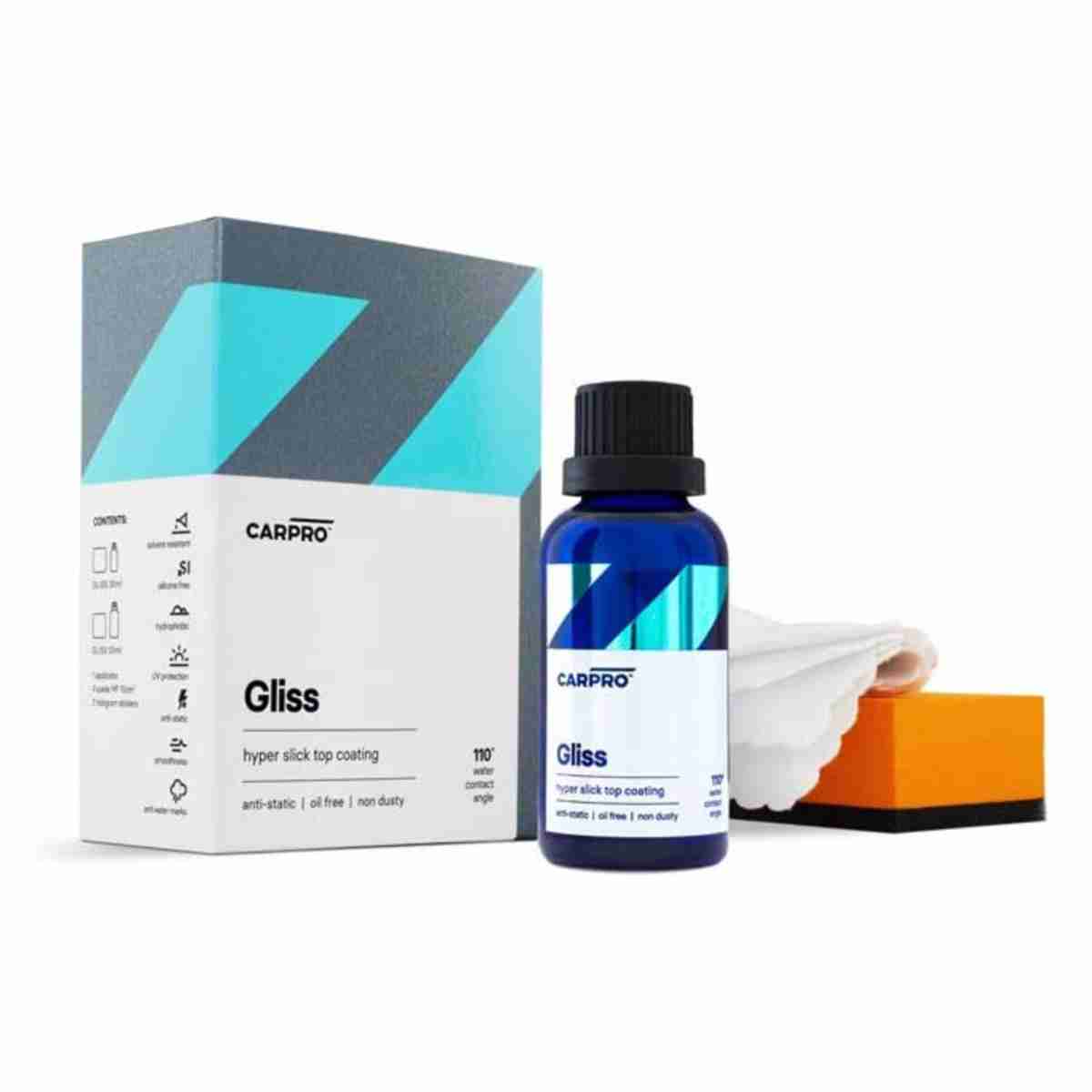 ANTI SCRATCH SURFACE: Slick and Hyper smooth Next Generation Top Coat! Industry leading sliding angle! Also works as a stand-alone nano-coat!Kit Includes: (1) 50ml bottle of CarPro GLISS (1) Applicator Block (4) 4inches Microfiber Suede Applicators.