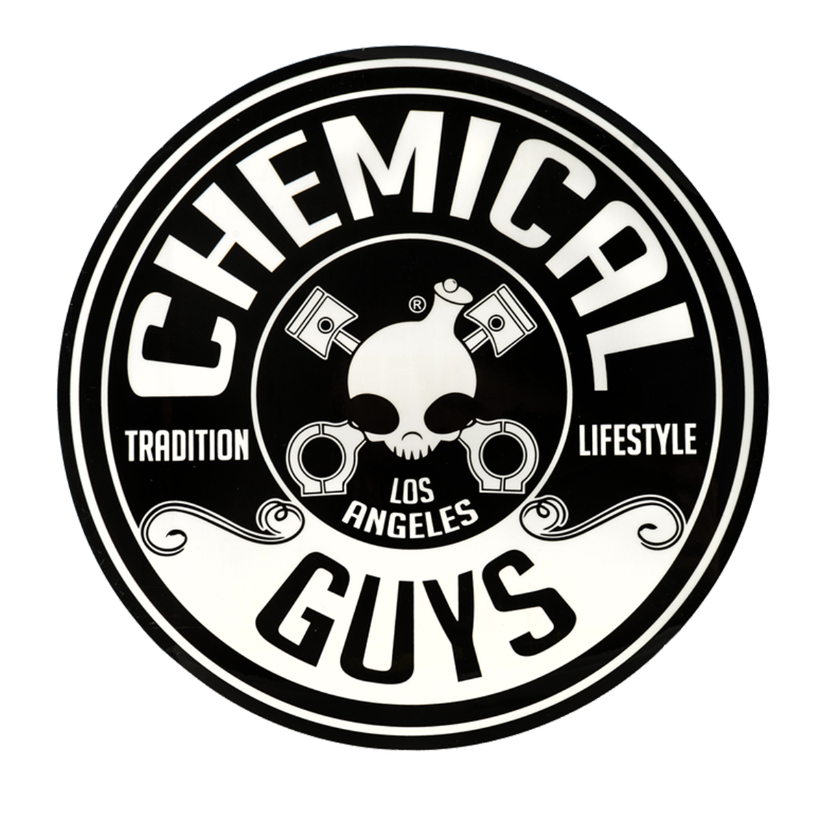 The all-new Round Decal features the new Chemical Guys crest–a mean skull engine block with piston crossbones emblazoned with our fundamental passions: Tradition and Lifestyle. Our entire brand is represented on this one roundel. Stick it anywhere to show your custome