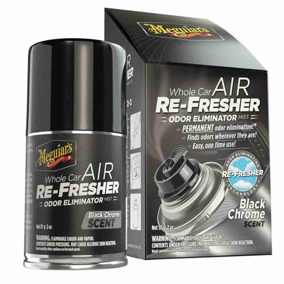 Air freshener with a pleasant new car scent If your car doesn’t smell quite as fresh as it used to Meguiar’s has a great solution that’s permanent, quick and easy. Meguiar’s Whole Car Air Re-Fresher Odor Eliminator Mist New Car Scent penetrates the complete interior of your car, truck or SUV eliminating unwanted odors permanently*. This one-time use air freshener flows through the ventilation system, across the headliner and in-between all other hard to reach areas, eliminating odors and leaving