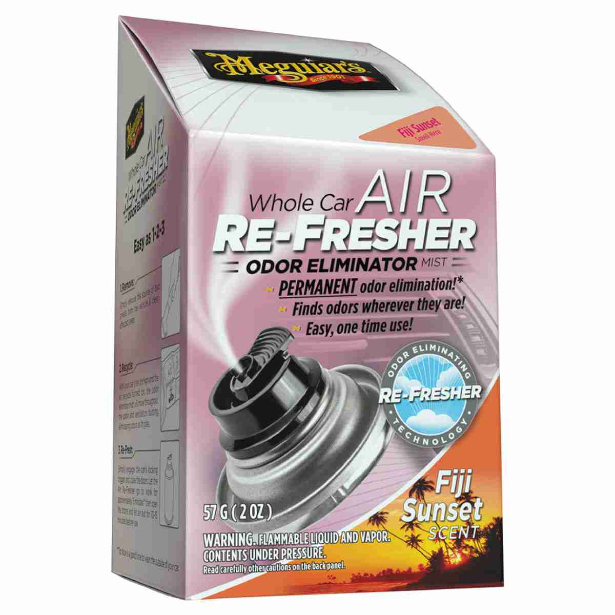 Air freshener with a pleasant new car scent If your car doesn’t smell quite as fresh as it used to Meguiar’s has a great solution that’s permanent, quick and easy. Meguiar’s Whole Car Air Re-Fresher Odor Eliminator Mist New Car Scent penetrates the complete interior of your car, truck or SUV eliminating unwanted odors permanently*. This one-time use air freshener flows through the ventilation system, across the headliner and in-between all other hard to reach areas, eliminating odors and leaving